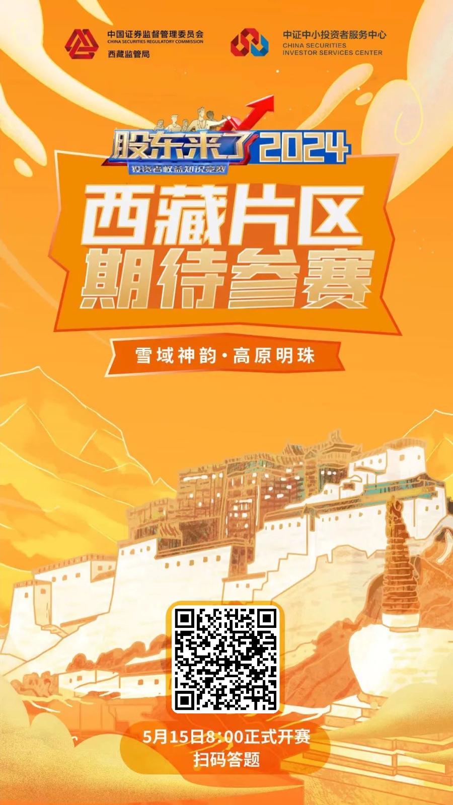由中證中小投資者服務中心主辦,上海、江蘇、西藏、深圳證監(jiān)局聯(lián)辦的《股東來了》-2024投資者權益保護知識競賽活動于5月15日正式啟動。本次活動采用網(wǎng)絡答題方式,分設上海、江蘇、西藏、深圳四大片區(qū),掃描下圖二維碼即可參與“西藏賽區(qū)”答題活動,請全體同仁踴躍注冊并積極參與。