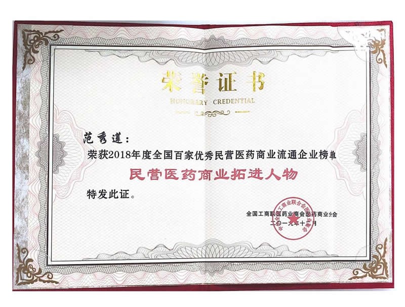 • 2018年度全國百家優(yōu)秀民營醫(yī)藥商業(yè)流通企業(yè)榜單-民營醫(yī)藥商業(yè)拓展人物-范秀蓮